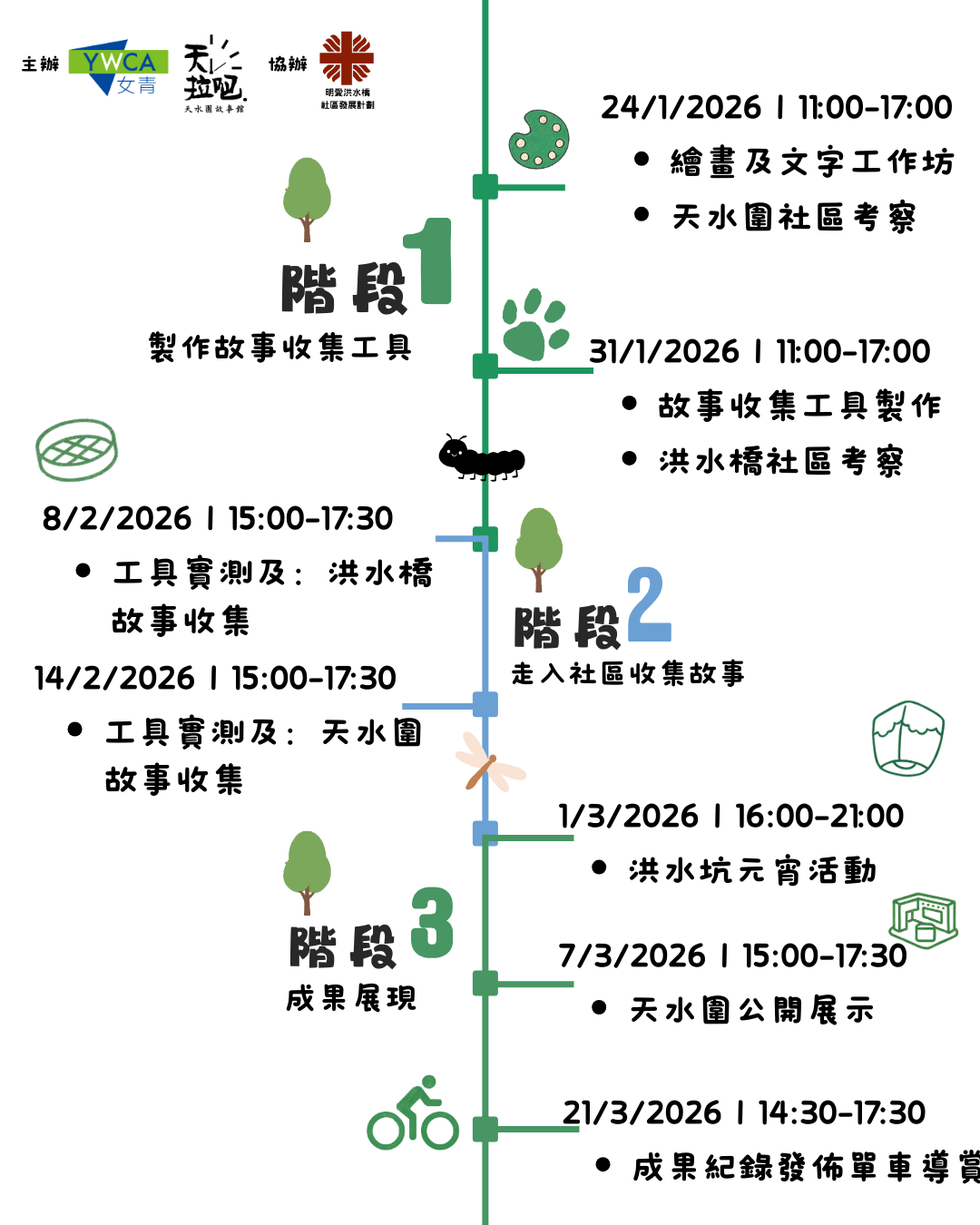 洪水橋,一個即將面臨清拆與發展的傳統村落;天水圍,一個已發展的新市鎮。這兩個地理相近卻發展脈絡截然不同的社區,隱藏著豐富的生活故事與共通的文化價值。為了記錄這些故事,YWCA天拉吧-天水圍故事館跟明愛洪水橋社區發展計劃合作,探索都市變遷下的生活模式,我們誠邀大家參與「日常好地地」計劃,透過故事收集、繪畫創作與互動交流,連結社區、發掘文化,並一同創作以大地圖呈現的社區故事,一同發展出一條單車導賞路線,以騎行連結兩地,走訪地圖上的故事與空間,作為最終成果發佈。