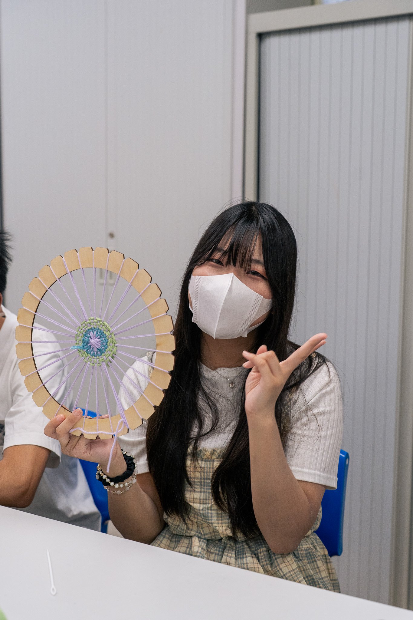 生命之眼的十字編織:參加者運用十字編織技法,將不同色彩的紗線排列組合,整理自己的幸福感受,並將祝福寄託於作品中。