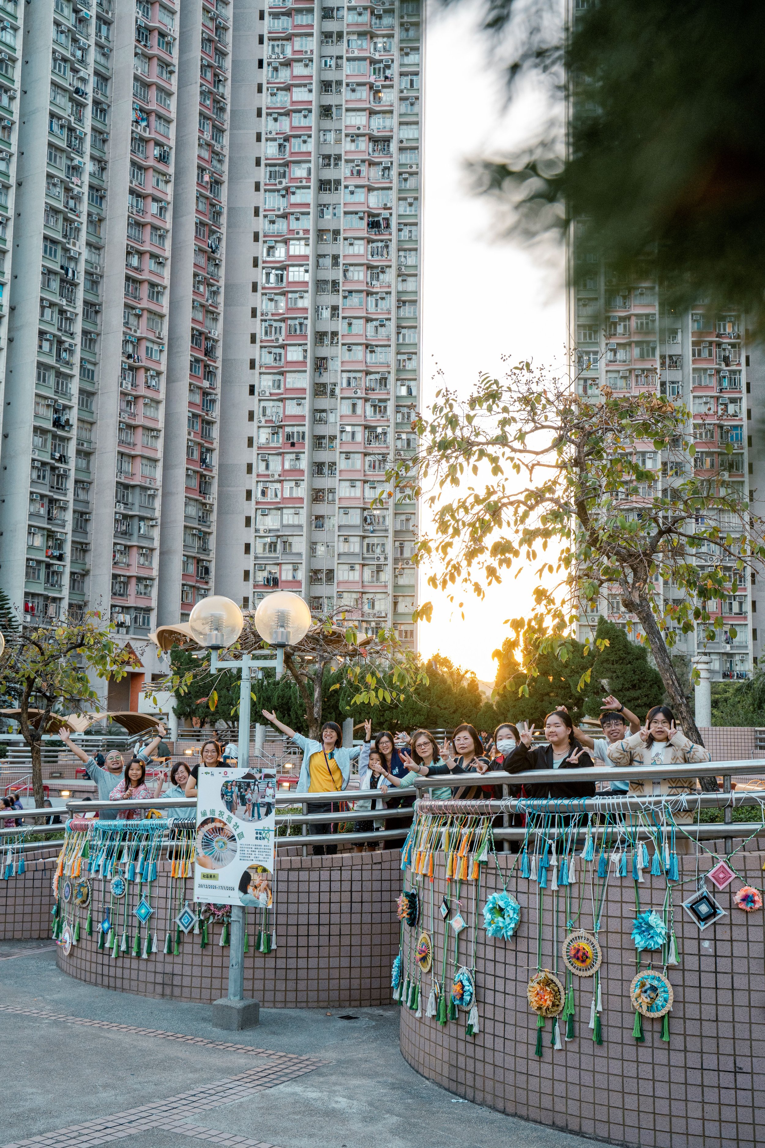 「幸福織造所」一大特色是社區創作與公共空間展示。天水圍屋邨建築色調偏向樸素。在粉紙色的拱形麻石牆上,參加者不僅共同創作色彩繽紛的作品,也一同設計展覽的佈置形式,親身參與從創作到佈展的每一個環節,體驗公共空間如何被重新想像與活化。